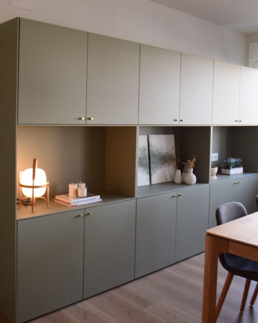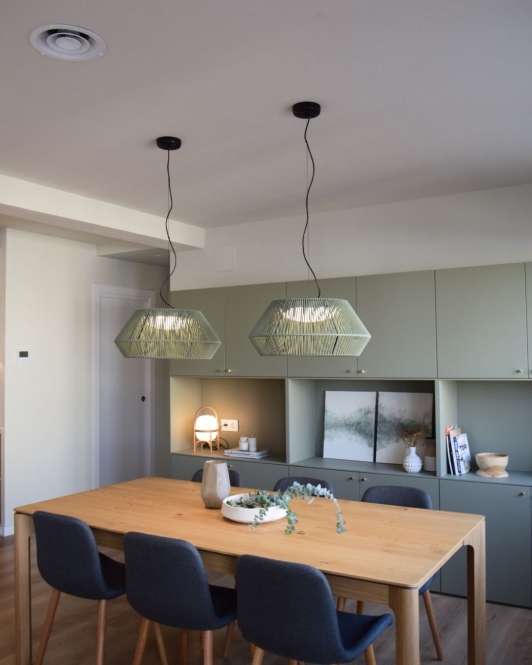 El moble d’emmagatzematge en verd oliva, de Tobisa, introdueix un punt de color que dona caràcter a la zona de dia. Les làmpades decoratives de corda d’Ole Lighting aporten calidesa, mentre que la il·luminació tècnica de Beneito Faure garanteix confort i funcionalitat.