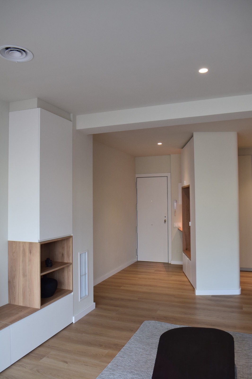 L’entrada també s’ha pensat com una peça clau del conjunt, amb un moble separador i pràctic que facilita el dia a dia i ajuda a mantenir l’ordre des del primer moment.